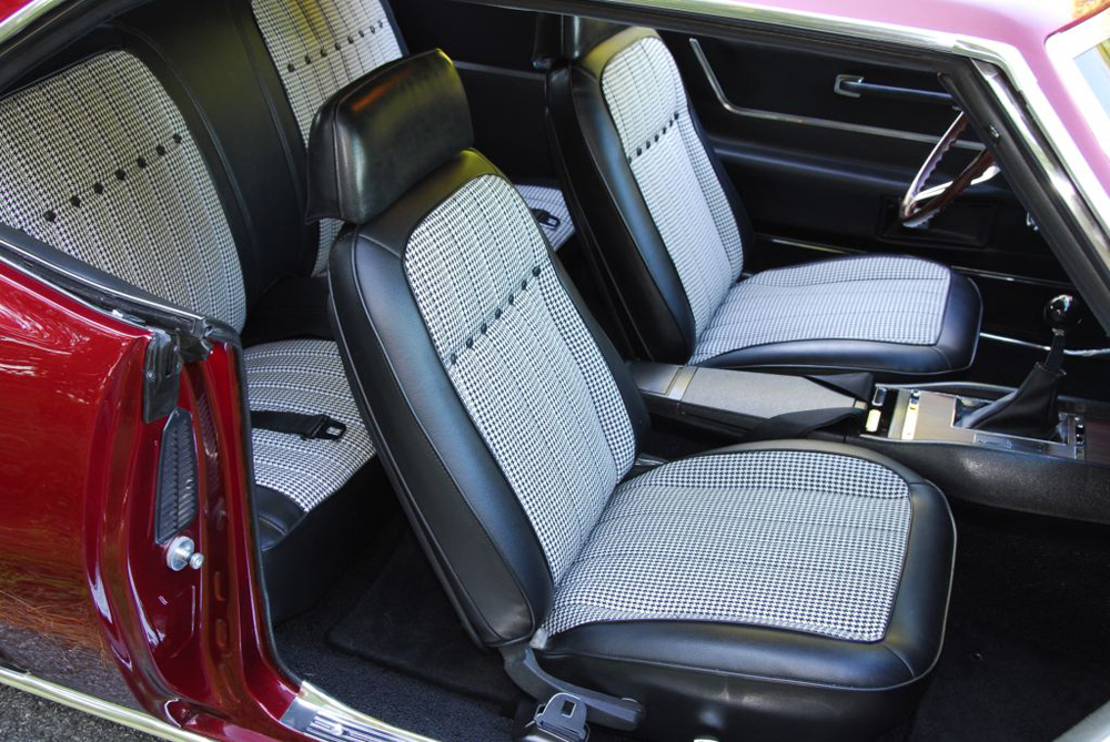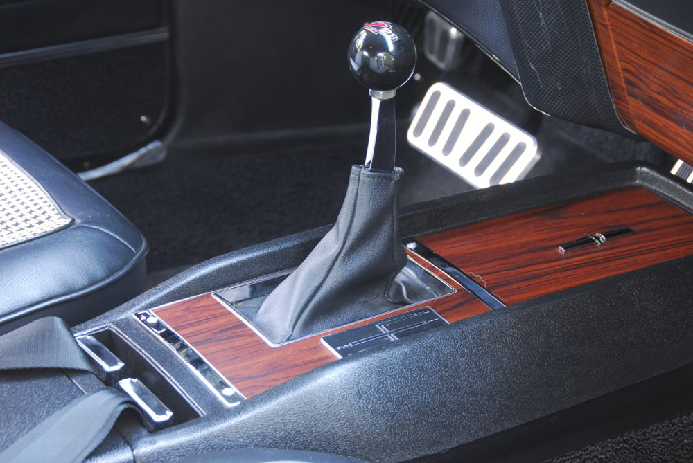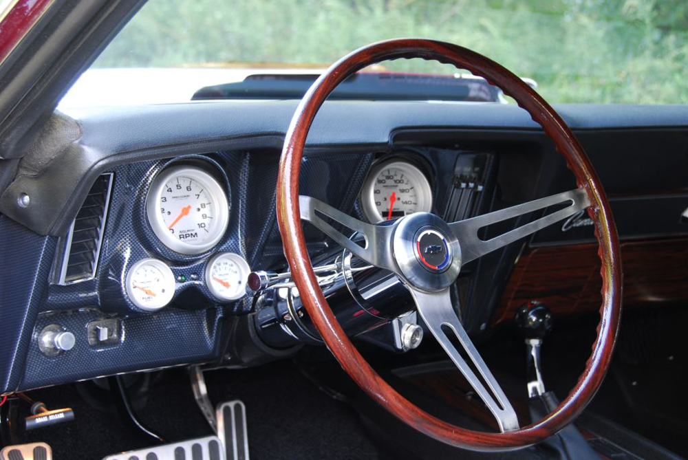 Once the behemoth woke to shake the earth, the interior was finally glammed up with the seats being recovered in black and white houndstooth by Todd Meyers while Robert Norris returned to install the balance of the interior. Classic touches like a rosewood steering wheel and trim melds perfectly with Auto Meter gauges and carbon fiber dash accents.