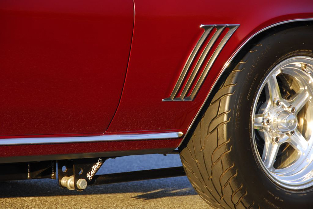 Out back a Strange 12-bolt rear filled with 3.73:1 cogs is suspended in place by Calvert Racing’s split monoleaf springs and CalTracs traction bars combined with QA1 adjustable coilover shocks.