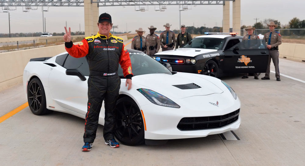 They don’t do small in Texas. Big burgers, big steaks, big trucks and now…big speed. Noted son of the Lone Star State John Hennessey, he of the many horsepowers has claimed first blood in the C7 Corvette big-bhp wars, cracking the magic 200mph barrier on a closed section of Texas State Highway 99.