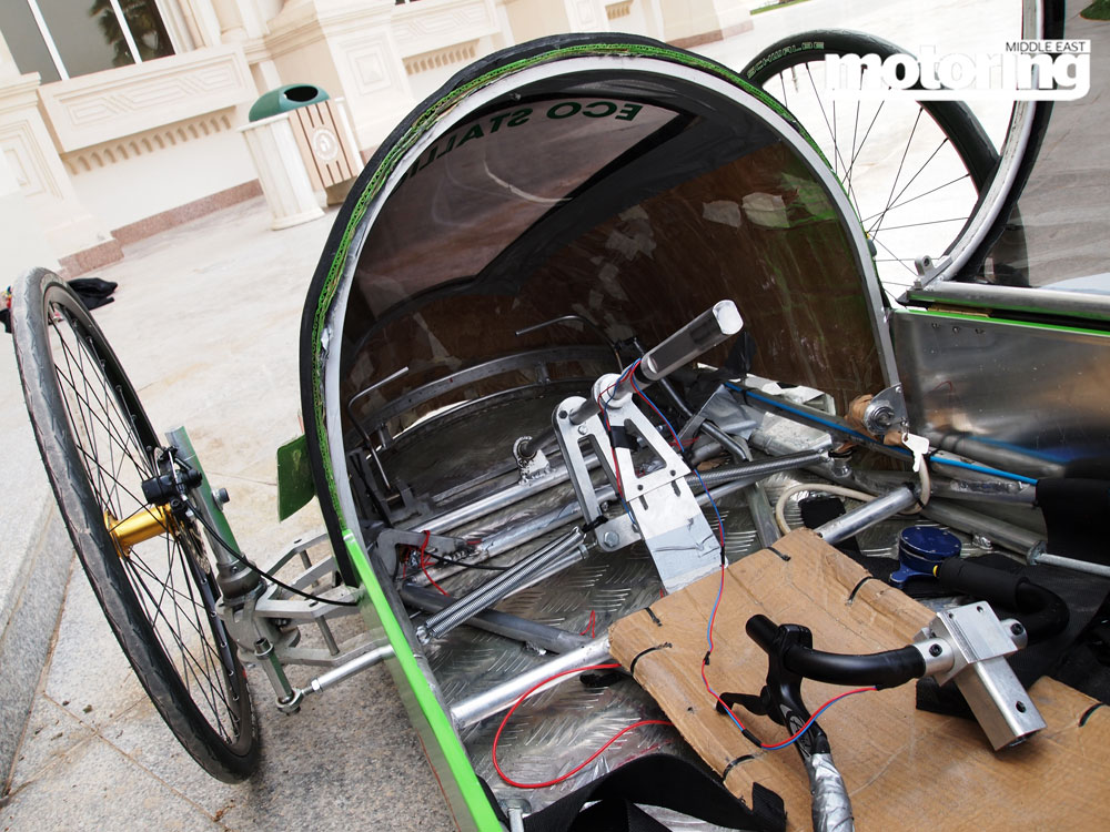 The car weighs 85kg; with a driver it’ll weight 140kg, Khan explains. The Eco Marathon challenge is to go as far as possible, on as little fuel as possible. Under the hood – well, actually the tail – is a German-made Hatz 243cc single-cylinder diesel engine that produces 4.8bhp and drives the sole rear wheel through a bicycle-style, locally-made transmission. The tyres are also special-order item from Germany, while the brakes are bike-style four-wheel discs. Suspension? Not required, so not installed.